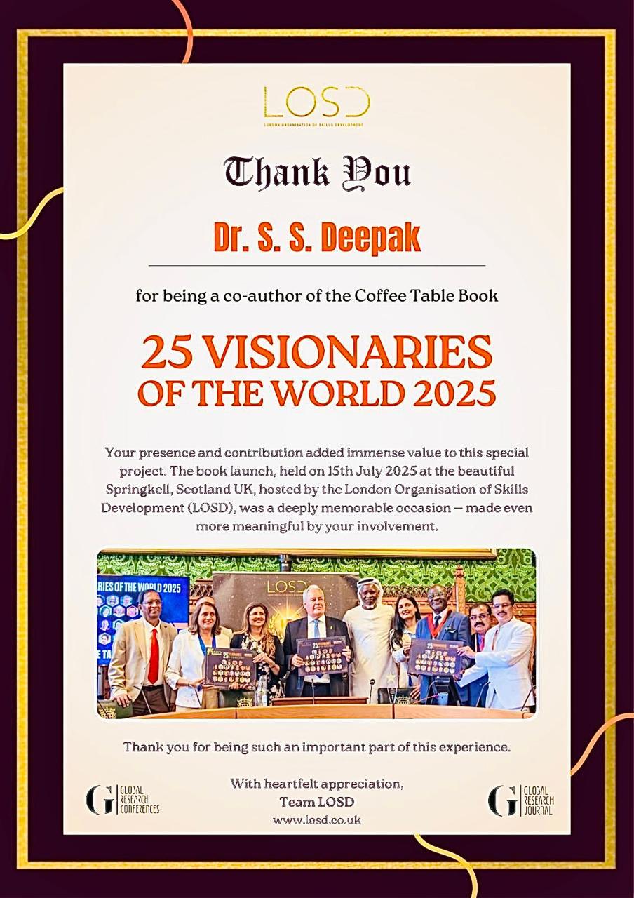 Dr. Deepak S.S. has been honoured as one of the "25 Visionaries of the World 2025" by the London